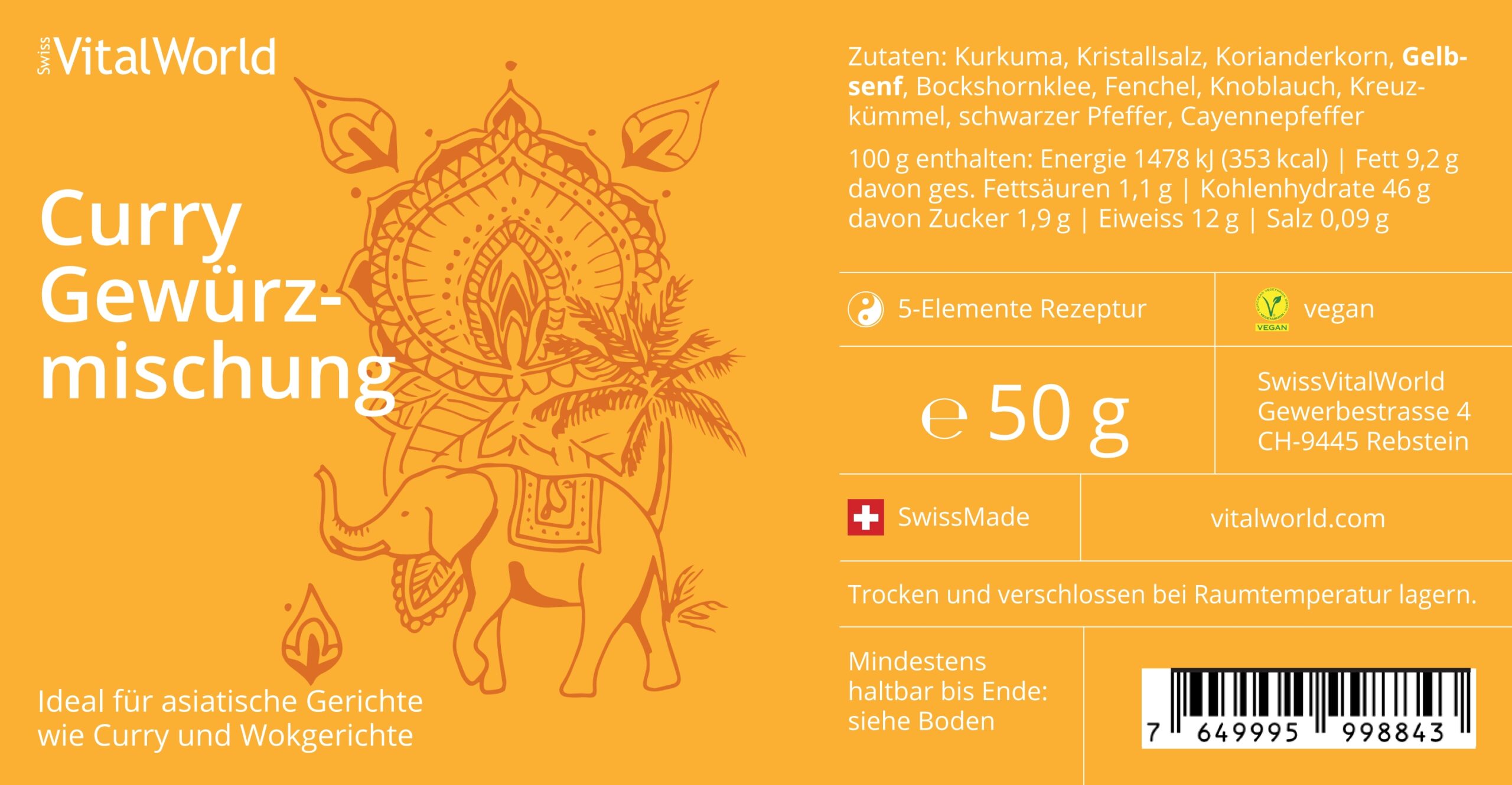 Inhaltsstoffe: Kurkuma, Kristallsalz, Korianderkorn, Gelbsenf, Bockshornklee, Fenchel, Knoblauch, Kreuzkümmel, schwarzer Pfeffer, Cayennepfeffer